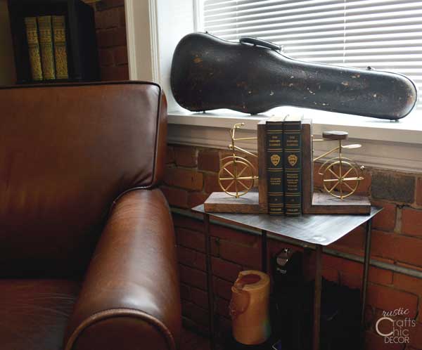 Some of my vintage books have gold lettering on the bindings. To enhance the gold lettering, I held a couple of the books up with some chic bookends. The gold finish of the bicycle blends well with the existing decor. I think it brightens up the space a bit with the shininess.