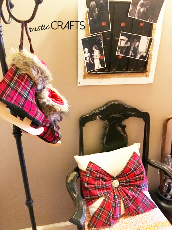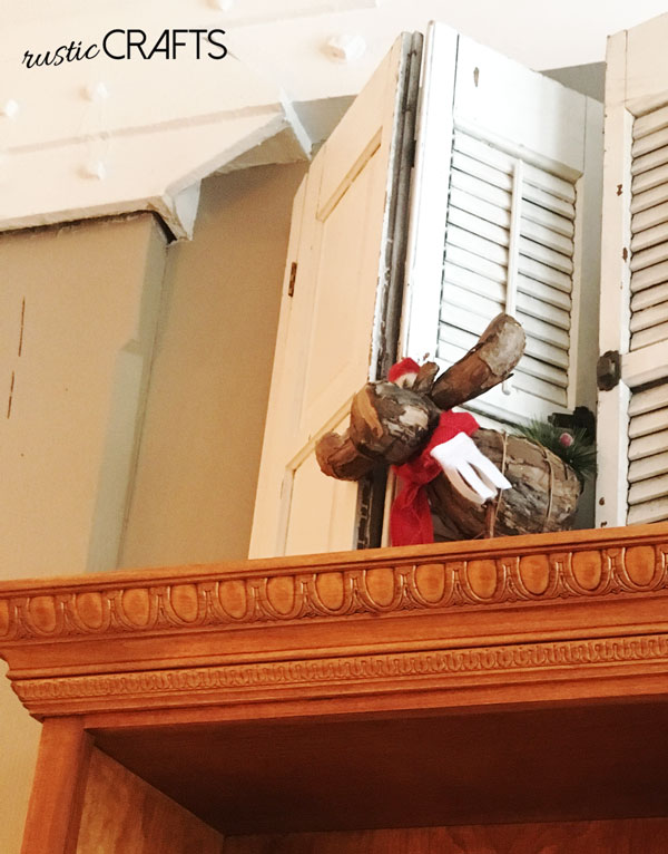 I love my rustic Christmas moose! Having him tucked between my vintage shutters gives the impression that he is just walking out from behind them.