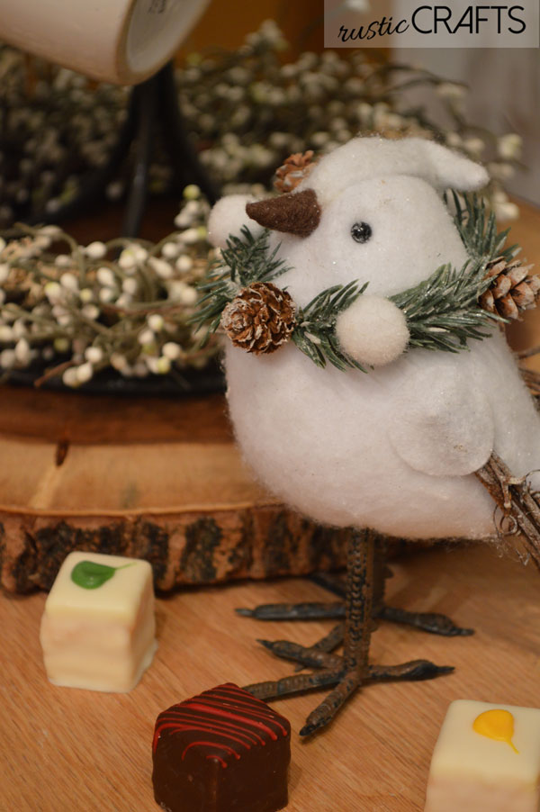 The little bird is standing next to a rustic wood serving platter. I use this a lot for dressing up other plates or using it on it’s own. I especially like it at Christmas with some added greenery.