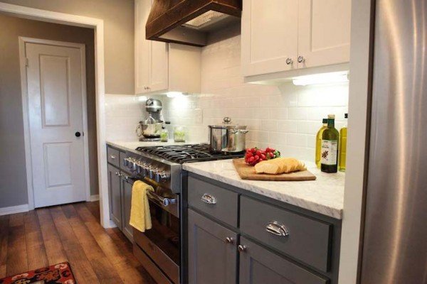 A fun way to perk up a kitchen is to stay neutral with the upper cabinets but then go a little crazy with the lowers. This idea from Magnolia Homes shows the bottom cabinets in a stylish gray. I personally really like this choice of color but have seen much bolder ideas such as royal blue or teal green.