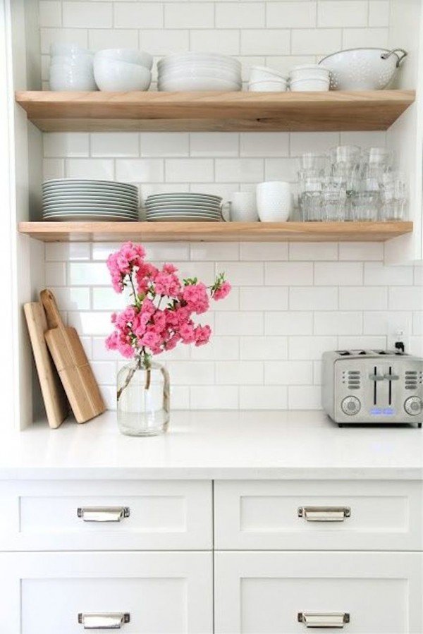 Replacing kitchen cabinets with some open shelving is a good way to create a more open and airy feel to the room. This trend has been a popular, inexpensive update to kitchens that also allows for some unique displays. This example from Pop Sugar is very soothing with the all white dishes against the white subway tile back drop.