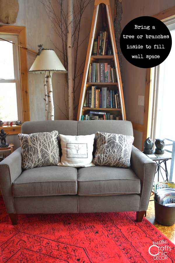 This tree was simply put in a heavy vase and placed behind the sofa to add a rustic touch. Because we also have the lamp made from birch, it ties in pretty well.