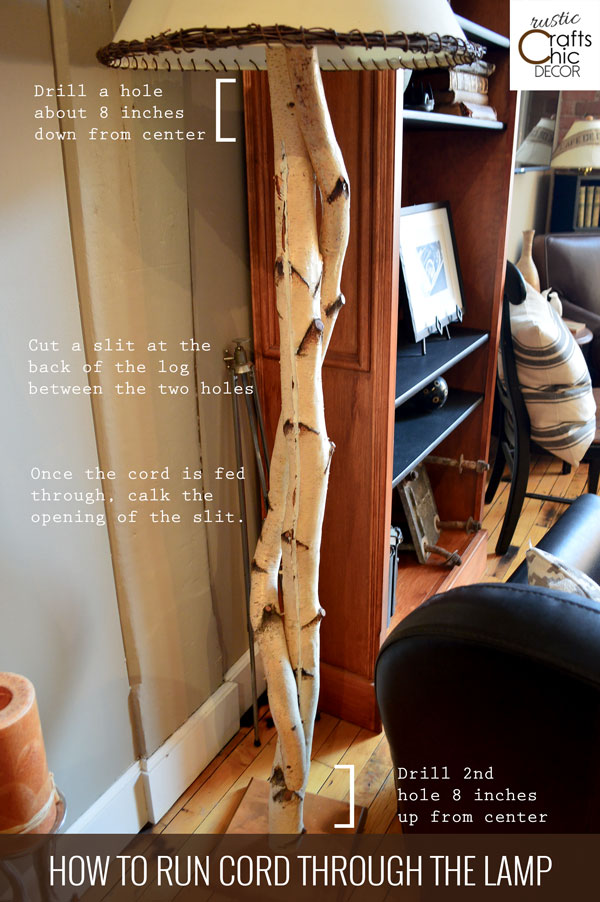A floor lamp is a little more tricky but uses the same exact procedure. You just need about an 8 inch drill bit to drill a hole from the top of the log down the center of the log. Drill another 8 inch hole starting from the bottom going up the center. We then just cut a slit in the middle of the tree log to join the two holes in an area at the back of the lamp. It’s easiest to use an electric saw. The cord then gets tucked in and fed through the holes at the top and bottom.