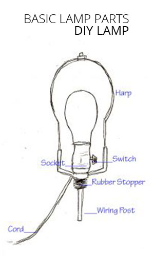 You basically just need to purchase a lamp wiring kit and fit the parts into your wood by drilling holes where appropriate. We also used oak bases for our floor lamps. You can make a base from any type of wood that you want and finish it with paint or stain. Just use wood large enough to make the lamp stable! Here is a diagram of the basic lamp parts in a kit:
