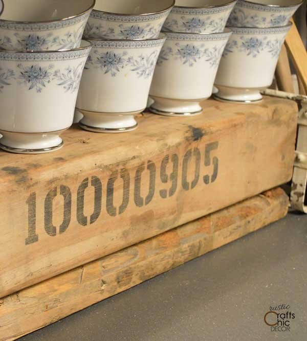 Another somewhat odd but super cool decorating item is salvaged wood. I was so happy to come across this old piece from some kind of pallet. The stamped numbers are what really did it for me. I needed a place to store my china teacups and was looking for a shelf. This chunk of pallet sitting on my counter acts as a nice anchor display for my cups. I love the contrast of the fine china and the worn wood.