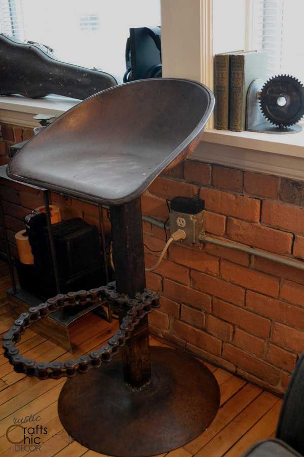 A metal scrapyard is a wonderful place to collect industrial pieces. This stool was made from a variety of rusty metal parts collected from a scrapyard. The seat is an old tractor seat and the footrest is some kind of industrial chain. My husband welded all of the parts together to create the unique design. The gear bookend, behind the stool, was also welded together from a scrapyard gear and metal ends from a building supply store. The vintage violin on the windowsill is just a nice worn piece that fits well with the room.