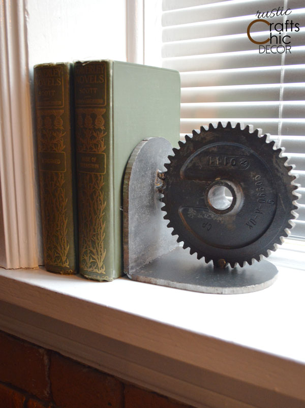 I love the look of gears to use in industrial decor. I had my husband weld this one into a fun bookend.