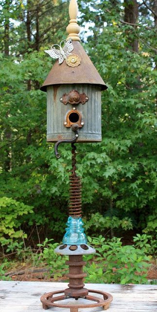 A scrap metal birdhouse by The Brambleberry Cottage.
