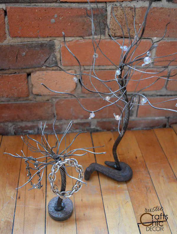 These scrap metal trees were easily made by just unraveling and twisting industrial cable into shape. The end of the cable was then welded to another metal part to use as a base. Any type of part would work for a base as long as it would keep the “tree” upright and stable. I like to hang bracelets from the smaller tree. With the larger tree, I wanted to keep it just for decor so I simply hung clear beads from the branches. This gives the tree the look of glistening ice in the Winter.