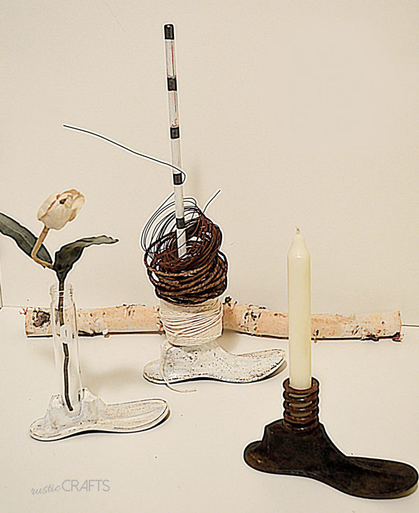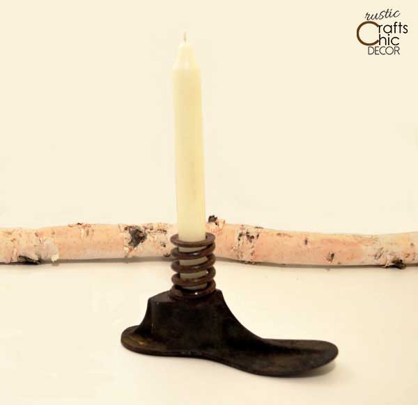 Finally, I figured that I should also have a candle holder. I found an old rusty coil that would be perfect to combine with my last shoe mold. It was just the right size for holding a taper candle. I used by favorite E6000 craft glue and the construction adhesive again to combine the two parts together and walaa… a candle holder.