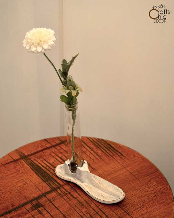 For my second project, I made a bud vase by combining a shoe mold with a vintage glass test tube. I inserted the test tube just like I had done with the dowel in the project before and again painted the shoe mold white.