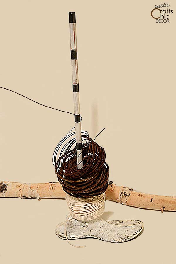 My first idea was to make a twine and wire holder using one of the shoe molds and a part of an old pants hanger.